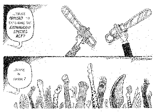Cartoon showing vote to oppose or extend Endangered Species Act